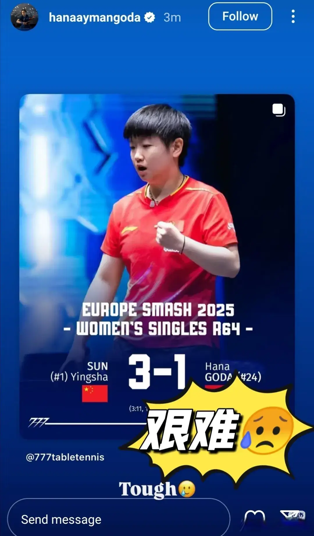 昨晚孙颖莎和汉娜•高达的比赛,很多主播和球迷也很关注。汉娜•高达曾说自己研究了孙颖莎的280场比赛世纪汇通,两个人第一次交手的时候,莎莎3-2艰难赢下比赛,汉娜•高达赛后发文说自己和莎莎的比分很接近;昨晚的比赛结束后,汉娜•高达再次发文:“她是一个很难对付的选手。”打的多了,就知道孙颖莎的厉害了。