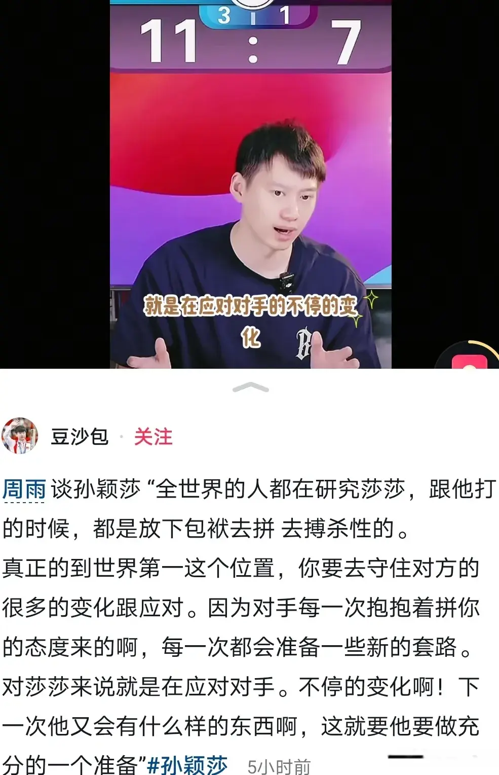 看了很多版本的解说,确实莎莎就是这样,我不一定要跟你去拼,我还可以打旋转、打节奏、打落点,她的变化多,所以说莎莎打球很灵。希望接下来的比赛中,莎莎继续加油,打出自己想要的球来。