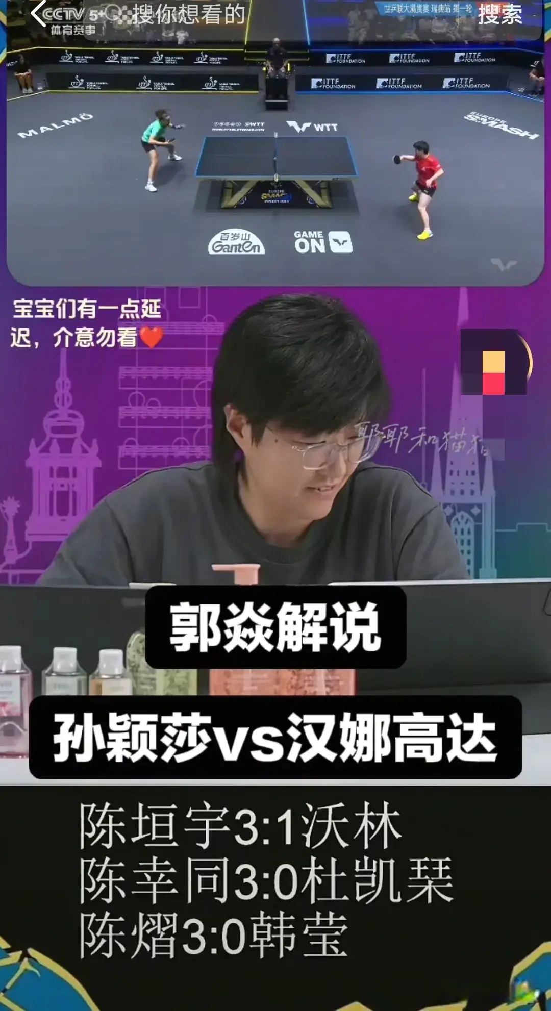 昨晚的比赛中,看得出来17岁小将汉娜•高达准备的很充分,应该是特意练了发球,首局莎莎接不好她的发球,汉娜•高达是以11-3赢了第一局,当时可把小孩儿开心坏了,以为自己胜券在握的样子,赢一分就大喊一声,确实遇到莎莎时,她就很兴奋。看了第一局的比赛,郭焱说:“汉娜•高达还来劲儿了。”